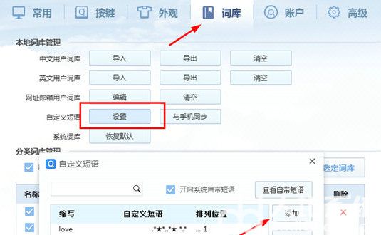 1、在输入框上右键【选项】,在【词库】中选择自定义短语设置,添加自己的短语输入