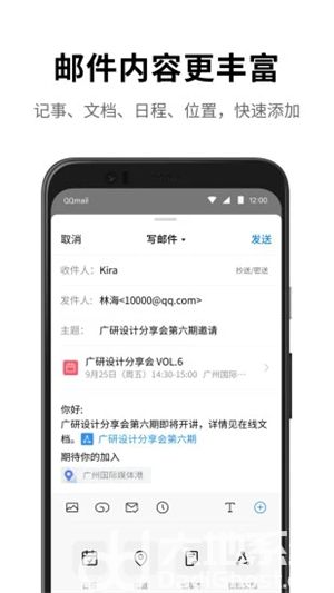 1.撰写样式丰富,支持多样化的邮件格式和地理位置插入