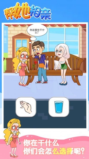 帮她相亲是一款非常有趣的休闲益智类闯关游戏,帮她相亲玩家在游戏内将帮助主角小姐姐在各种情境下进行详情,游戏内包含了丰富的谜题玩家可以来完成,面对各种不同的场景需要玩家来动脑解决,成功完成任务通过闯关,找到隐藏的细节来触法内容,非常考验玩家的情商还有应急处理的能力,玩起来非常的有趣,卡通的游戏界面非常的有代入感