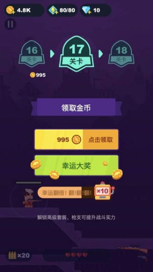 1、得到更多的金币钻石,升级武器提高你们的战斗水平和实力