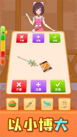 换个啥啊小游戏ios版是一款非常好玩的休闲益智小游戏,换个啥啊小游戏ios版需要玩家不断地揣摩对手的心理进行博弈,每一次都需要你和美女进行一对一交换,这样你才能够获得更多的财富,玩家每一次进行兑换的时候,需要考虑价值,不然就会亏本,游戏里面不同的元素可以自由的筛选,游戏体验感十足。