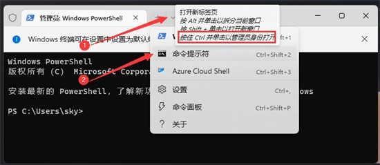 2、打开【管理员: Windows PowerShell】窗口,①位置点击【下拉箭头】,②位置【按住 Ctrl 并单击以管理员身份打开】命令提示符。