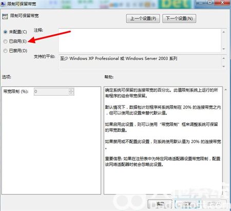 4、弹出限制可保留带宽的界面后,将下图红色箭头所指的已启动点击选取。