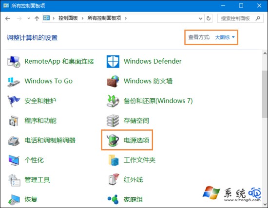 2、接着在控制面板窗口中,将查看方式切换成“大图标”,在设置列表中点击“电源选项”,如下图所示: