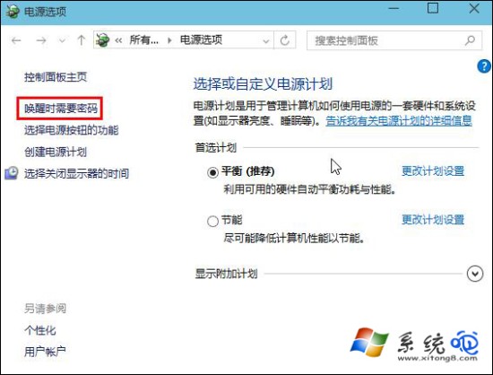 3、进入电源选项页面后,点击左上角的“唤醒时需要密码”,如下图所示: