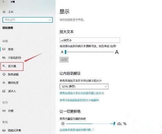 3、接下来在轻松使用页面中,我们在页面左侧找到“放大镜”选项并点击,就可以进行下一步操作。