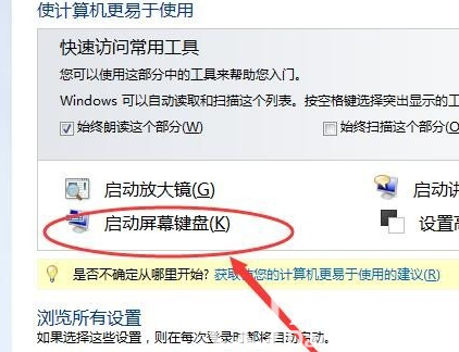 5、然后进入到轻松访问中心页面,就可以看到有一个“启动虚拟键盘”。