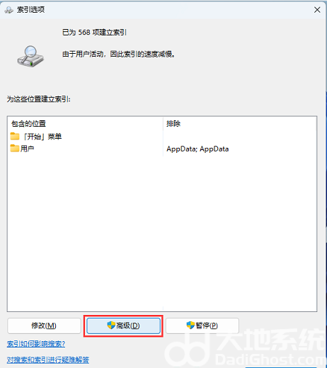 4、索引选项窗口,点击底下的【高级】;