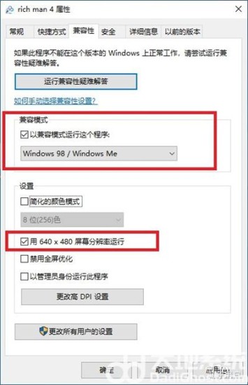 3、游戏右键属性--兼容性选98/me