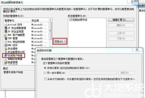 3.然后在左侧菜单栏中找到并打开“本地用户和组”,点击“添加”—“完成”按钮,最后点击“确定”保存。