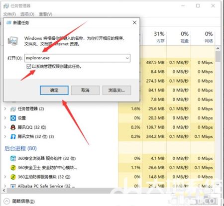 4、在输入框里输入explorer.exe,再勾选上以系统管理权限创建此任务,并点击确定即可。
