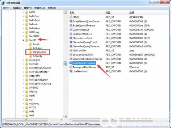2、找到注册表项“HKEY_LOCAL_MACHINESystemControlsetServicesNetBTParameters”。