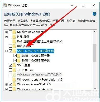 4、这时就会打开Windows功能窗口,在窗口中我们勾选“SMB 1.0/CIFS文件共享支持”前面的复选框,然后把其下面所有的勾选全部选中。