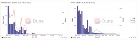 另外,DUNE数据则指出,Friend V2的交易量和交易者在5月中旬后大减,Clubs的创建和创作者数量也一样低迷。Friend.tech新推出的自家区块链是否能挽救目前黯淡的表现,仍有待后续观察。