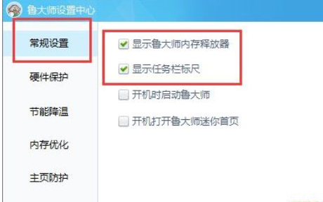 2、接着在常规设置中将“显示鲁大师内存释放器”和“现实任务栏标尺”前边的对勾打上就可以了;