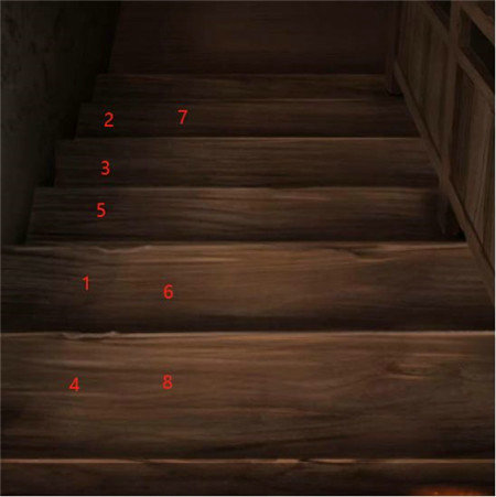 开始下楼梯,按照楼梯上脚印亮起的顺序,如图点击楼梯,打开楼梯尽头的暗道