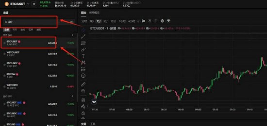 11、在搜索框输入BTC,选择BTC/USDT交易对,可以看到BTC实时行情