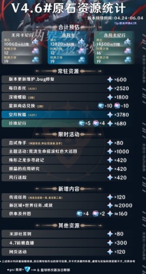 原神4.6可以获得多少抽 原神4.6版本原石数量统计