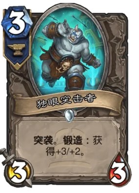 拥有“锻造”关键字的卡牌可花2费进行升级。牌的升级和打出不一定要发生在同一回合。例如,对下面这个3/3/3并具有突袭的随从,可以花费两费将其升级成为3/6/5并具有突袭的随从,以便在当回合或之后的回合使用。