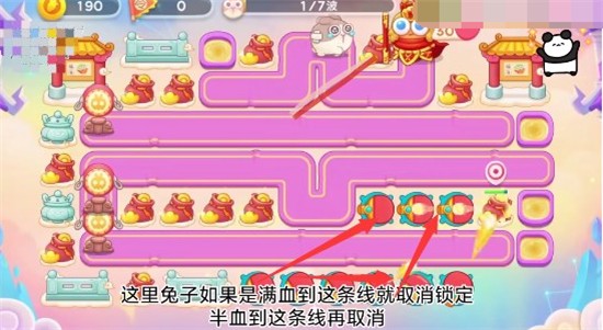 3、之后左侧直接锁定钱袋都打掉,打掉放球拍,没有粉兔可以先清理道具,有粉兔要先打掉,第四波之后神仙也就来了,第一个是葫芦的神仙,可以直接锁头打;