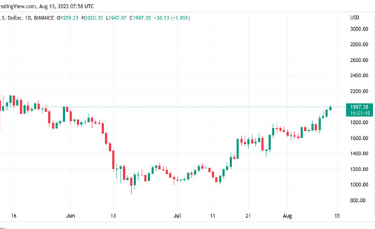 到目前为止,该货币对的价格为 2,020 美元,创下自 5 月 23 日以来的最佳表现,试图在撰写本文时在高点附近盘整。