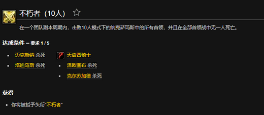 不朽者解锁条件:该成就需要团队在一个CD的周期内,击杀NAXX的全部首领,并且在BOSS战斗中无一人阵亡。