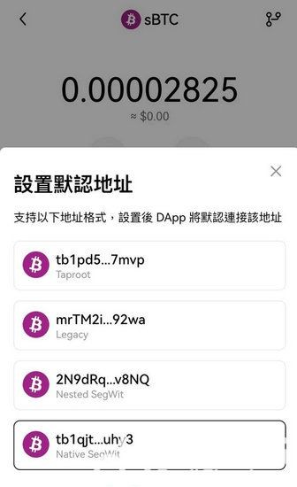 点击sBTC右上角图标,更改默认地址为Native SegWit