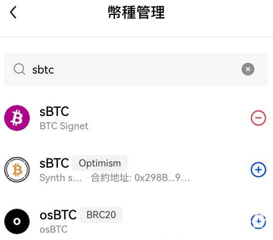 以OKX钱包为例,必须用电脑版且以助记词导入创建钱包,接着下拉钱包内资产就会看到「币种管理」,点击后搜索sBTC,选择下图第一个。