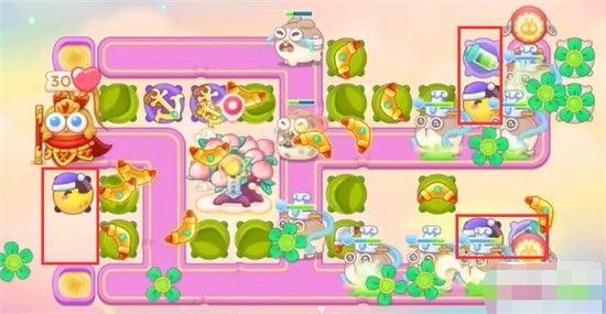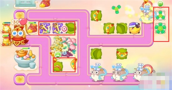 1、本关能够使用的炮塔是:毒针、月亮、船锚、风扇,回旋镖,这一关输出较多且都可以使用。