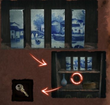 3、调整架子上的风景瓶朝向后,可以在暗中获取钥匙。