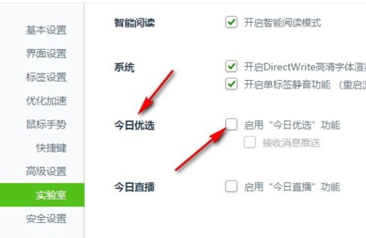 以上就是小编整理总结出的关于360安全浏览器关闭今日优选消息推送的方法,我们进入360浏览器,然后点击页面右上角的“三”图标,接着选择设置,在设置页面我们点击实验室,然后在页面右侧找到“启用今日优选功能”选项,并将该选项的勾选取消即可,感兴趣的小伙伴快去试试吧。