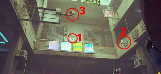 这3个摄像头分别在公寓入口上方、大厅左侧和大厅右侧(具体位置如下图),踩到摄像头上面就能让其瘫痪。