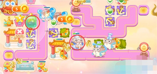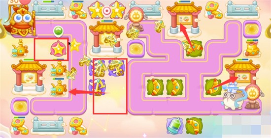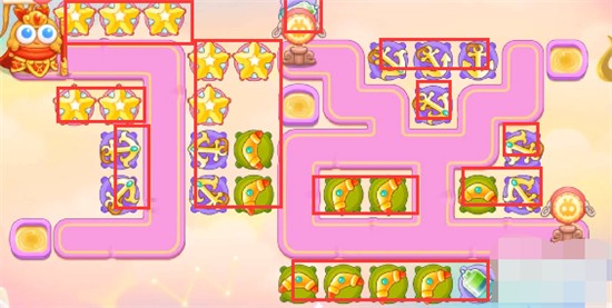 1、本关能够使用的炮塔是:毒针、回旋镖、船锚、闪电炮、星星、导弹,这一关我们用回旋镖和船锚输出。