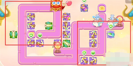 1、本关能够使用的炮塔是:船锚、毒针、鱼刺、回旋镖、泡泡塔、导弹,这一关我们推荐使用船锚+鱼刺。