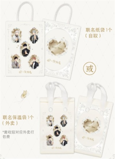 3.双杯套餐内周边为角色透卡,联名喜证,联名杯套均x2,联名纸袋or联名保温袋x1。