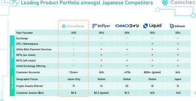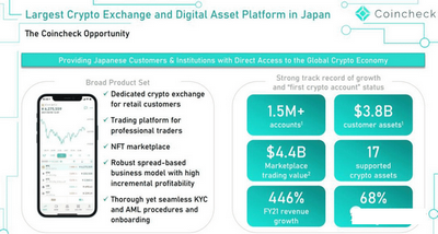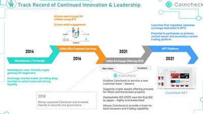Coincheck成立于2014年,是日本最大的加密货币交易所,拥有超过250万用户。2018年,它被成立于1999年的日本金融服务公司Monex Group收购,后者经营着包括在线经纪、资产管理和加密货币服务在内的多样化业务。