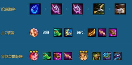迦娜神装不变,推荐开局有水滴大棒且2阶段爆2-3张时玩,否则跑路玩别的,妮蔻全肉装;佐伊、婕拉3星可多给把青龙刀+AP装;黛安娜如果能3也给肉装。
