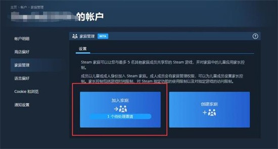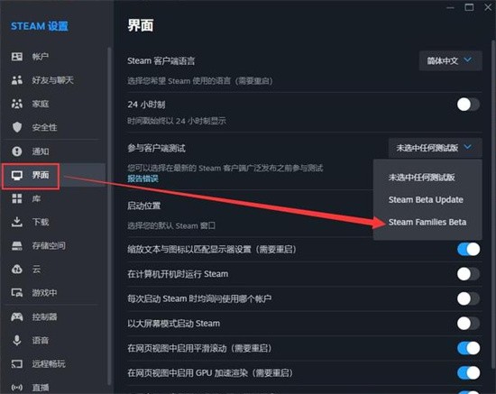 在Steam设置中点击界面-参与客户端测试-Steam Families Beta(家庭测试)