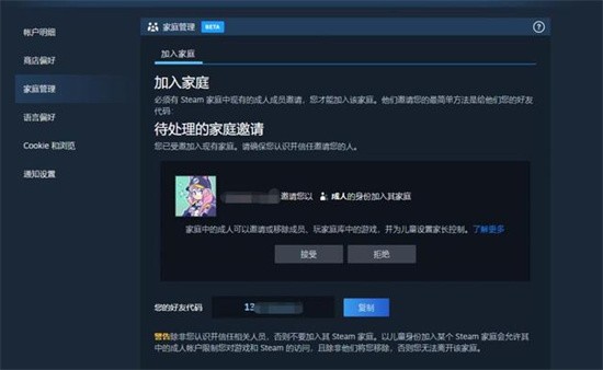 不过需要注意家庭成员的Steam账号需要是一个地区的,不然会提示邀请失败。