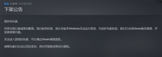 1.官方给出的理由是存在系统问题,有部分老版Windows无法运行,因此先下架Steam平台进行更新。
