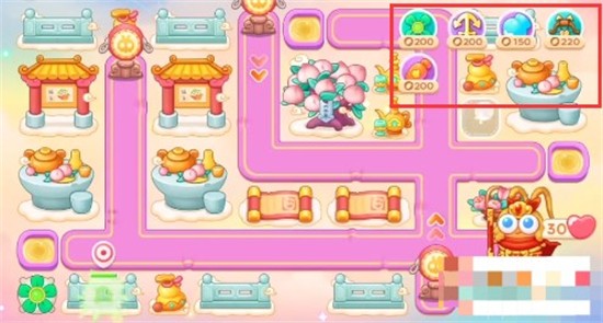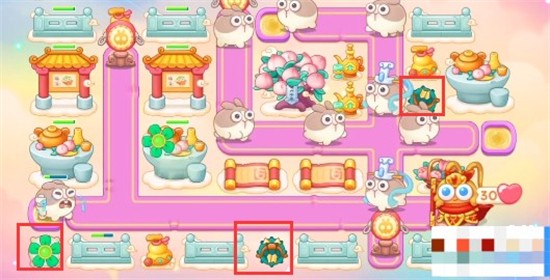 6、放置炮塔位置在下图的框内,蟠桃树附近放置火瓶打持续伤害,中间位置放置多重箭输出,出口处放置风扇,拐角处放置雪球。