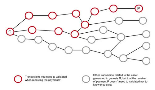 最终,由于使用了 UTXO 容器,一个 RGB 的合约的最新状态可以表示成一个有向无环图上还没有后代的点(每个点都表示一个存放在 UTXO 容器内的状态)。并且,对下图中的所有者 P 来说,他将只知道从合约的初始状态 G 到达他的过程,也即红圈标注的过程,而对灰色的点一无所知: