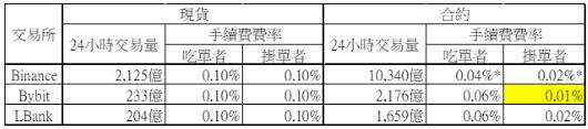 Binance、Bybit、LBank加密货币交易所手续费比较: