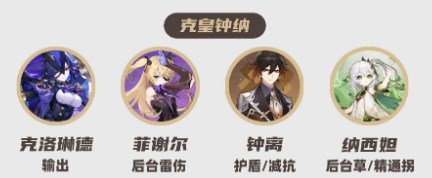 组成:克洛琳德、八重神子/菲谢尔、钟离、草神