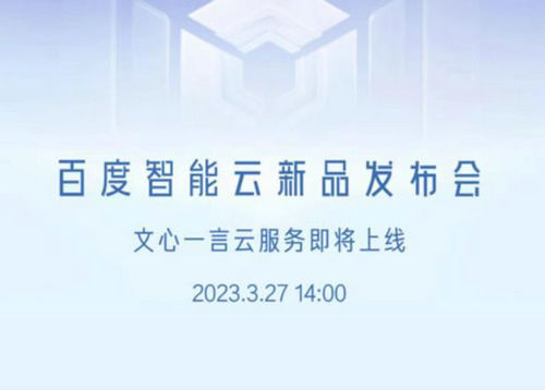 在百度智能云新品发布会上,官方公布文心一言云服务将在2023年3月27日14:00上线。