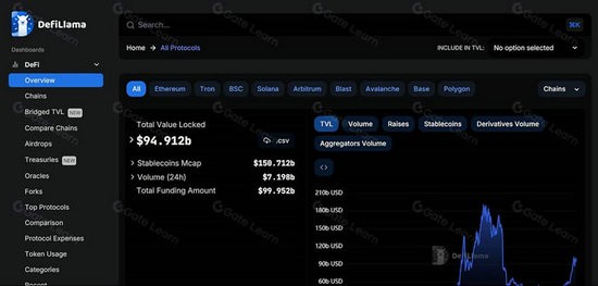 市场概况: Defilama 提供了 DeFi 市场的全面概述,包括总体指标,例如锁定总价值 (TVL)、交易量、流动性池、代币分配以及跨多个协议的流动性挖矿奖励。