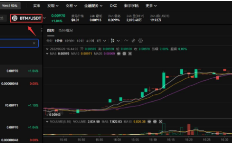 5.搜索比原链英文简称BTM,选择BTM/USDT交易对,即可看到BTM实时行情