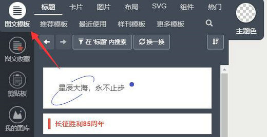 6、点击左上角“图文模板”,里面有大量的模板可以选择,包括标题、卡牌、图片、布局、SVG等。