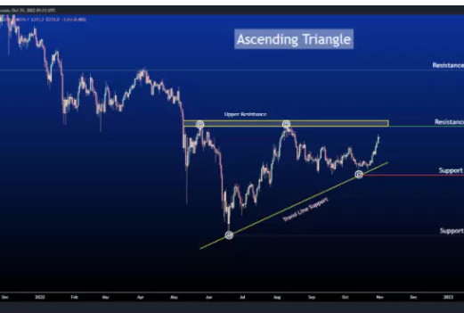 上升三角形是持续看涨趋势的特征模式。该三角形由连接高点的水平上趋势线和连接上升低点的下趋势线形成。如果趋势在阻力位突破,价格将继续以这种上升三角形模式向上移动。