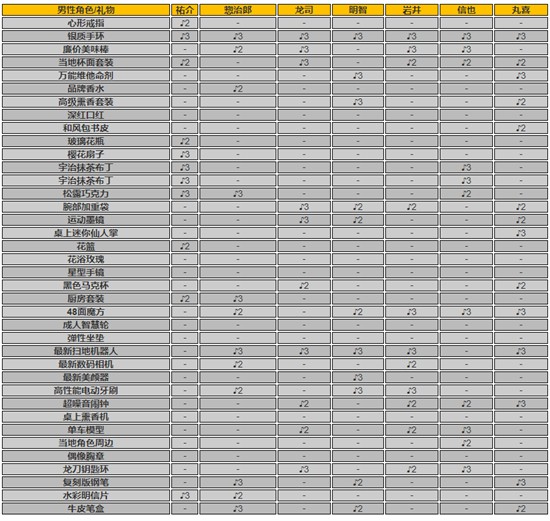 下表为各位女性角色所喜好的礼物,其中某些首饰价格很高,但只要掌握快速赚钱大法,也不是事,可恣意购买。